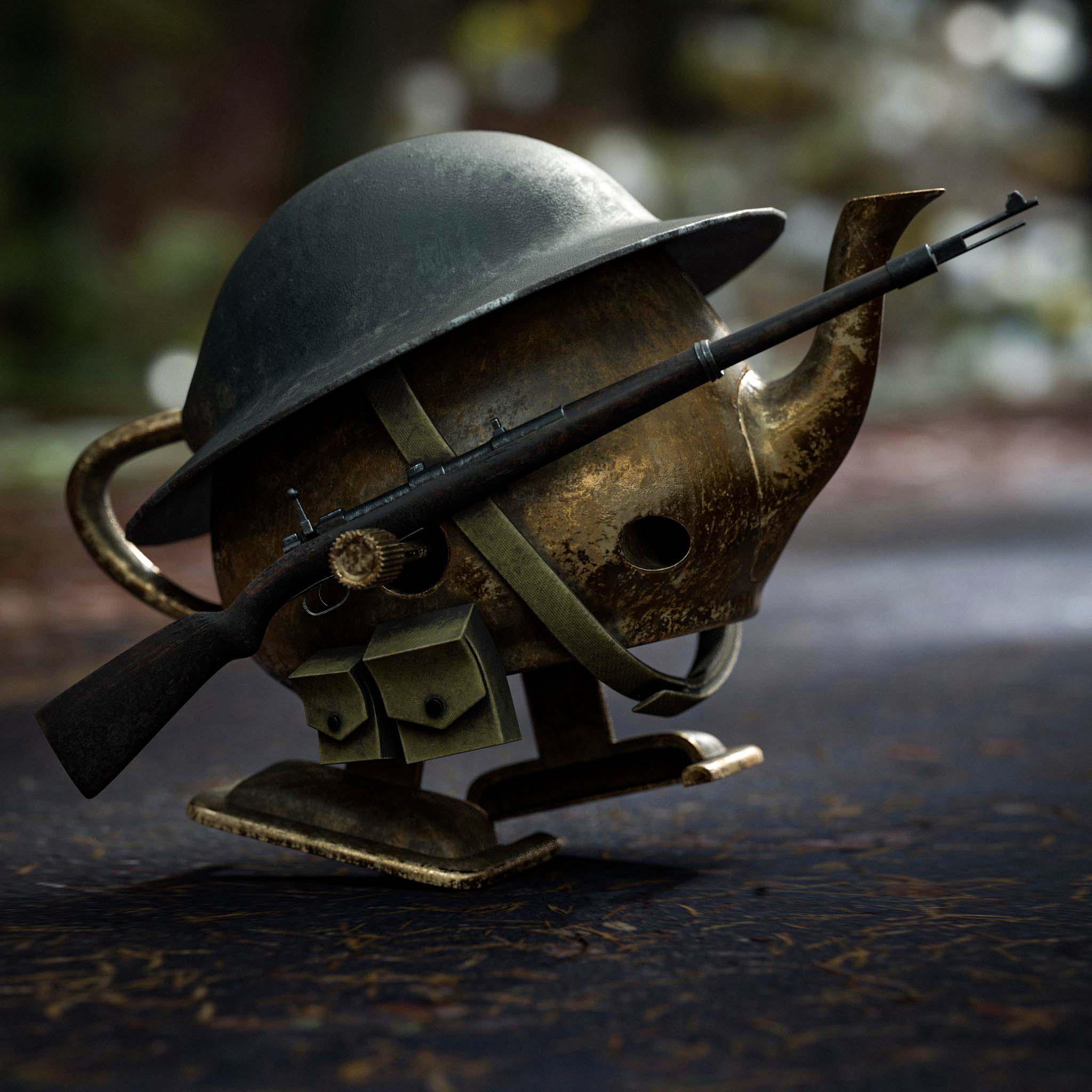 最后我决定做一个一战的场景。茶壶士兵在战壕里,而 MAT 军官站在战壕之上。更明确的是,我希望整个画面是动感的,就像电影中的一帧。于是乎我开始做调研,尤其从电影《1917》中汲取了很多灵感