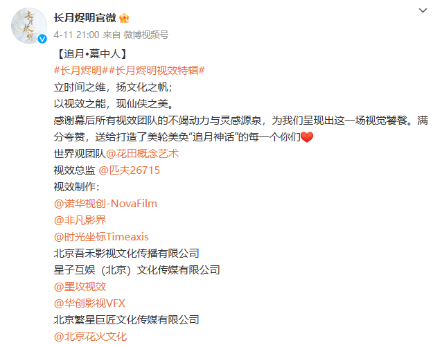 4月,《长月烬明》官微发布视效特辑,感谢了世界观团队花田概念艺术、视效总监沈旭锋以及幕后参与视效制作的9家视效公司——诺华视创-NovaFilm、非凡影界、时光坐标Timeaxis、北京吾禾影视文化传播有限公司、星子互娱(北京)文化传媒公司、墨攻视效、华创影视VFX、北京繁星巨匠文化传媒有限公司、北京花火文化,视效特辑中揭秘了《长月烬明》背后的故事设定、美术设定以及具体的创作历程