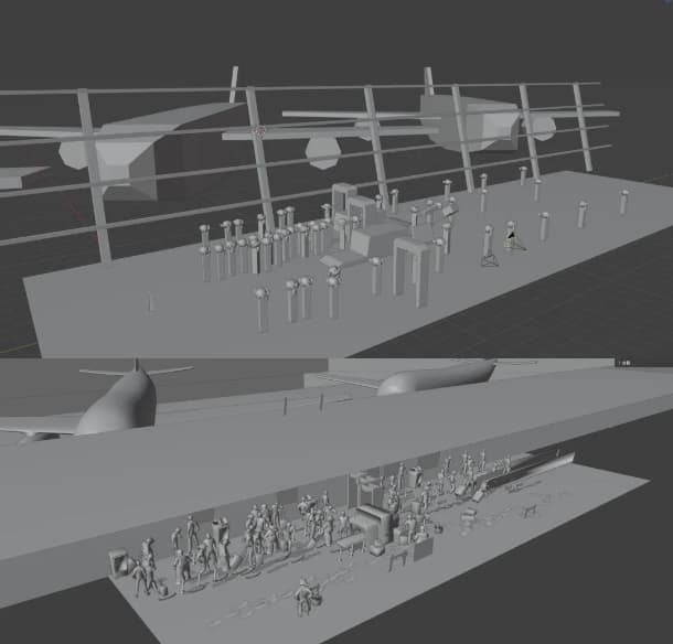 《托运办理已停止》这个作品我主要想塑造一个很多人排队拥挤静止的环境,只有主角是使劲冲的感觉,营造对比,同时其他场景的动画都是受主角影响,比如冲出来撞的行李箱等等。