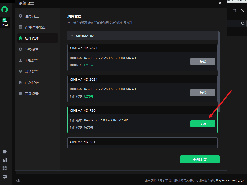 瑞云渲染客户端支持一键安装 C4D 提交插件,无需手动配置环境或处理复杂的插件部署流程,安装过程简单高效。