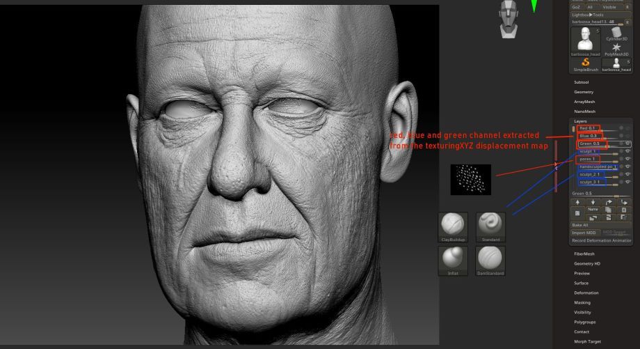 对于微细节,我导入了我在Mudbox中投影的“纹理化XYZ”位移贴图的红色,绿色和蓝色通道(您可以在此处找到类似的工作流程)。它们提供了不同的细节比例,在测试渲染之前很难说出这些“图层”的强度。