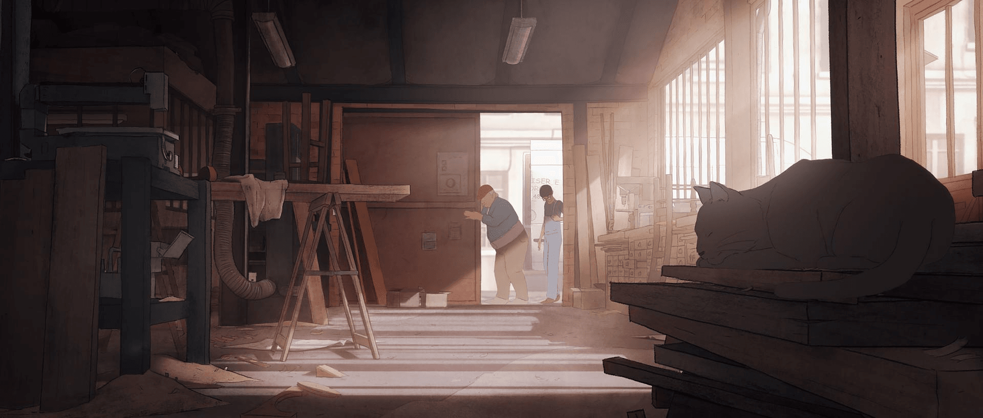 我们以一种基本的方式建模了所有的场景和角色,然后用CG(角色和摄像机动作)制作了动画。这让我们得到了一个更加有“实景”感的舞台,不同的角度和镜头移动比传统的2D电影更加进化。当观众从“手”的视角出发,他们会感觉到周围的空间,这是一种更强烈的体验。接下来,动画师重新设计了所有的东西,让电影最终呈现出来。动画师可以直接在CG上作画,这要归功于Blender里的Grease Pencil工具,让我们获得了宝贵的时间。然后,我们花了很多时间来合成,以便把这种非常电影化的一面融入进画面。