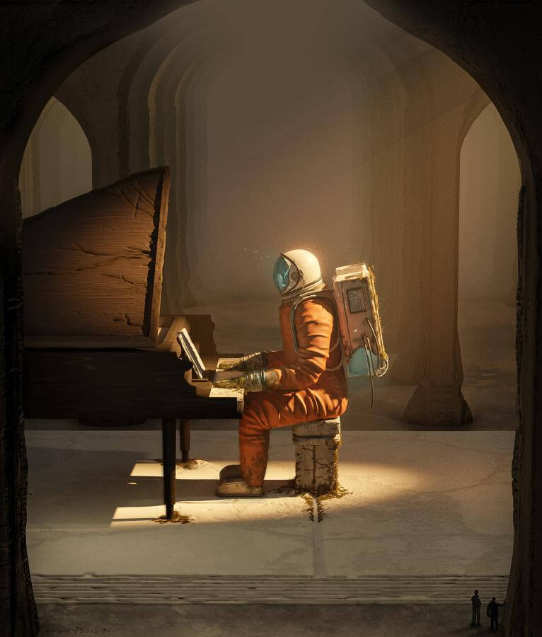 两个带有蓝色阴影的光源被放置在宇航员体内,使他的头盔和设备发出诡异的蓝色光芒。另外两个光源巧妙地用来突出他的手和钢琴。