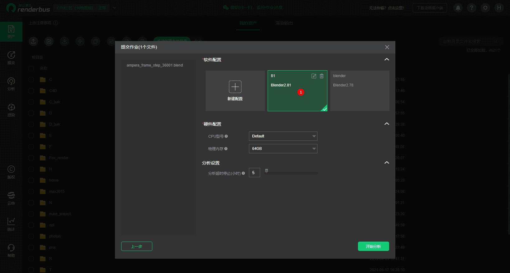 2.2. 在提交作业添加软件配置和硬件配置信息(注:渲染系统的选择),点击开始分析,耐心等待分析完成: