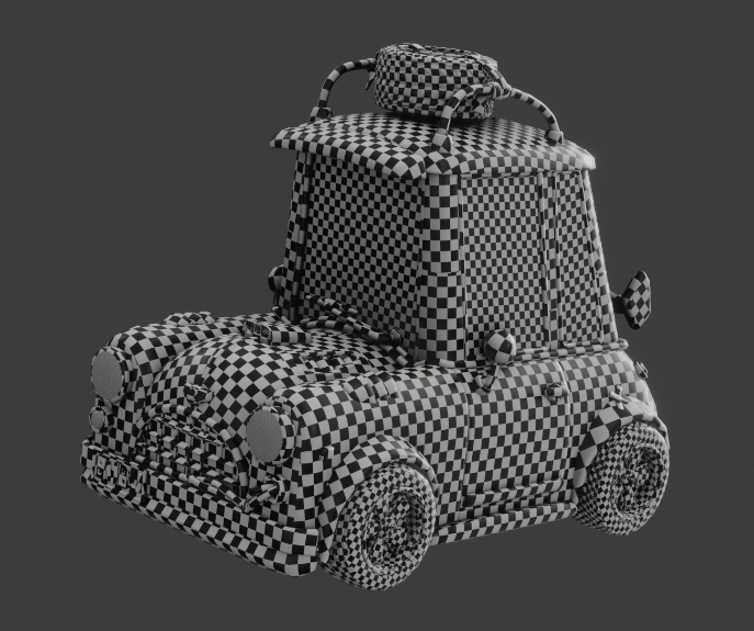 首先,我根据物品的位置和类型将模型分成几组,例如,顶部屋顶区域、轮子、正面和背面,然后我根据纹理密度缩放和排列UV,并使用了棋盘贴图。我在这个项目中使用了5个纹理集。