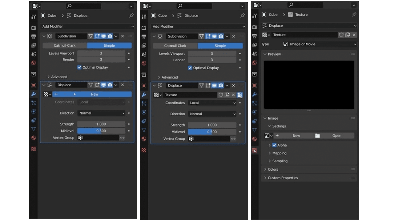 我们可以点击 "New(新建)"为置换修改器创建一个新的纹理,然后选择 "Show texture in texture tab(在纹理标签中显示纹理)"按钮,这将把我们带到纹理标签,如下图所示。