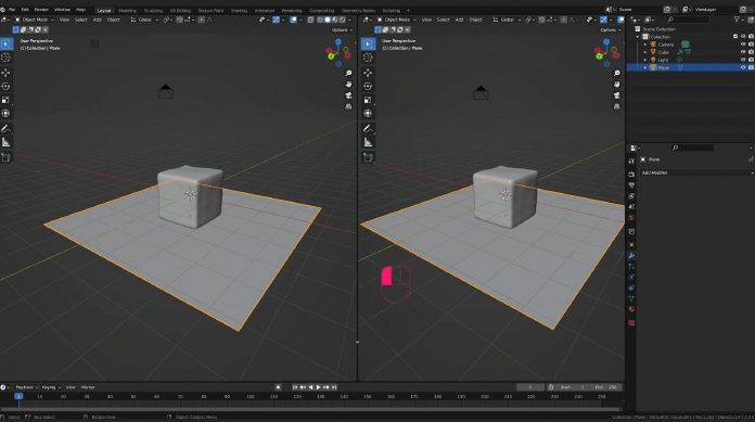 为了开始研究立方体的不透明度和透明度,让我们首先分割我们的视图。把鼠标放在视图的左边边界,直到你看到十字线,然后点击并向右拖动,直到视图被分成两部分。