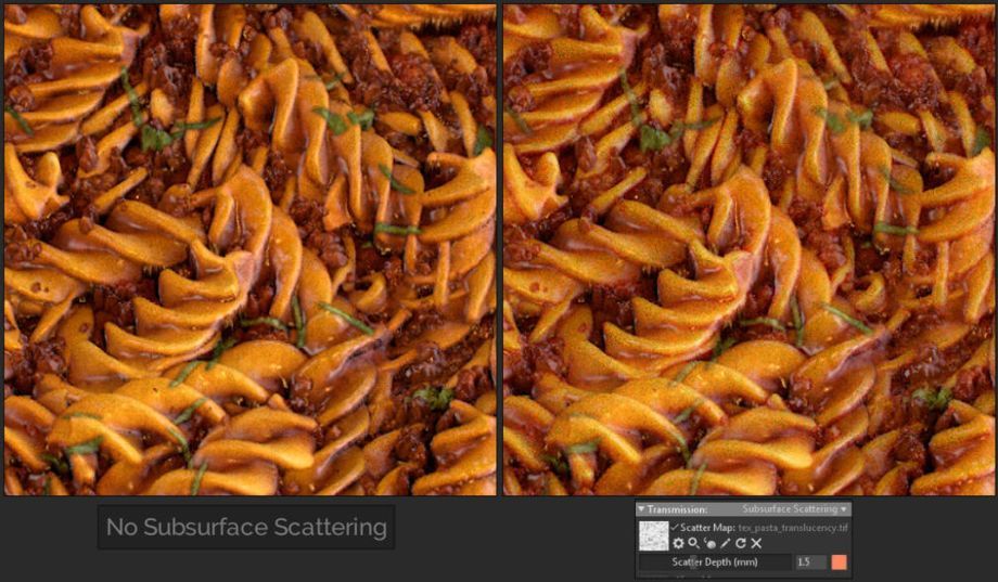 至于照明和渲染,我找到了一张漂亮的意大利面照片并复制了照明,这节省了我从头开始设计照明的时间,渲染这种材质的关键是次表面散射,没有它,材质看起来像塑料。