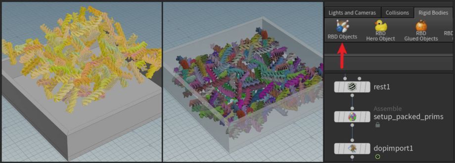 对于动态对象,我选择了整个面食,并将它们分配为 "RBD对象";当它完成后,只要让物理模拟发挥作用,我在 "来自体积的点 "节点中试验了不同的随机种子,直到我得到我想要的结果,然后我把 "DOP导入 "连接到 "解包 "节点。