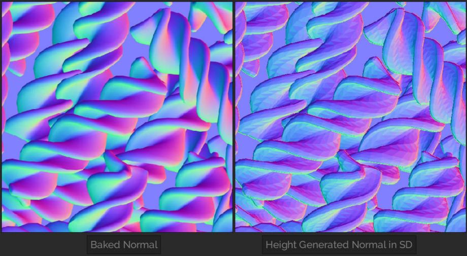 我没有在 Substance 3D Designer 中使用烘焙的 Height 贴图来生成 Normal 贴图,因为它会导致 Normal 贴图上出现伪影,所有的硬边都会可见,我可以增加细分级别,但它也会大大增加烘焙时间,这不是一个好的解决方案,到目前为止我还没有找到解决办法。