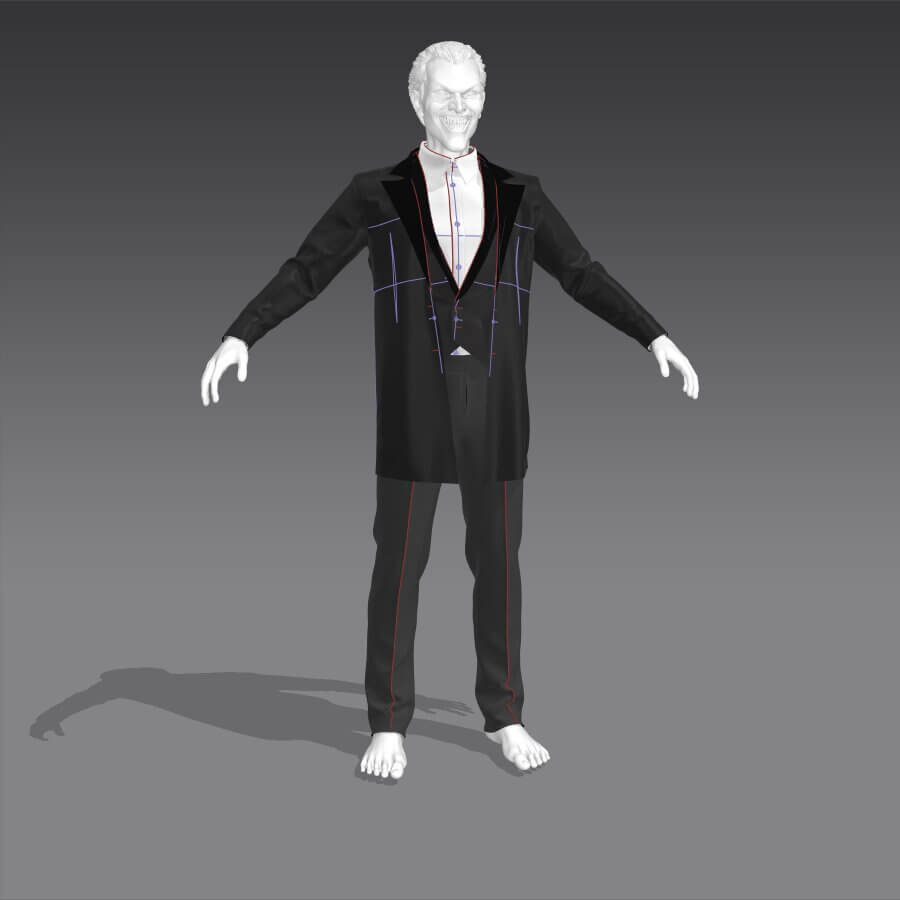 在服装建模的过程中,我使用了Marvelous Designer。我以 T 字姿势导出小丑,因为它有助于确保模拟过程中的对称性。我首先制作裤子和衬衫,然后制作燕尾服的各个部分。裤子和衬衫完成后,我开始制作背心。在此阶段,我利用冷冻功能来调整重叠的部分,并确保与其他服装元素正确贴合和对齐。