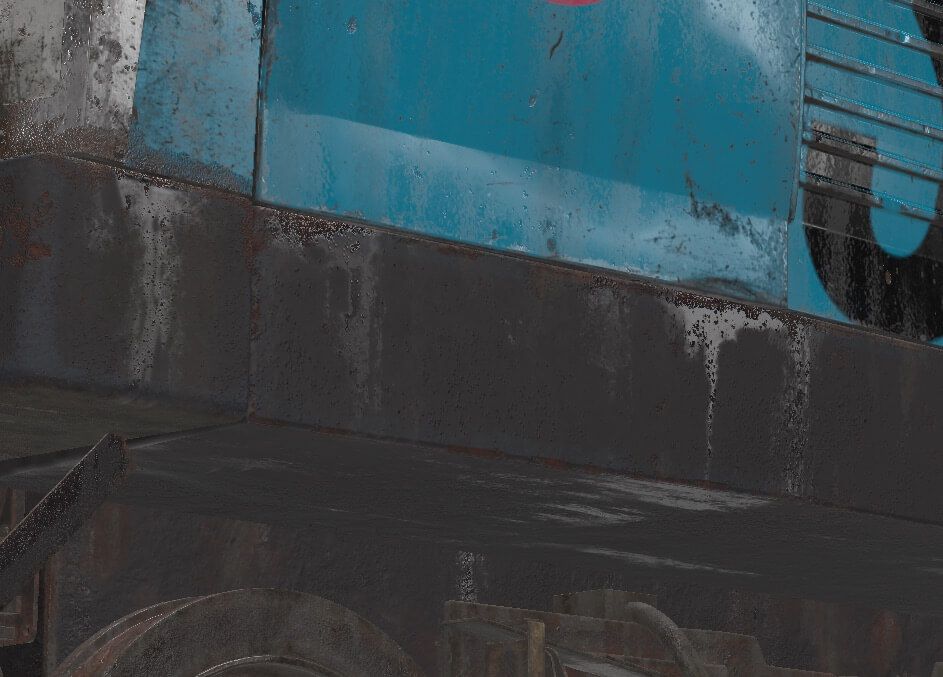 我没有对灯光做任何太花哨的事情,我使用了 Painter Studio 02 中我最喜欢的工作室灯光环境作为环境光。我确保火车顶部有亮点,可以产生漂亮的反射来展示粗糙度图。我还添加了聚光灯,从侧面照亮火车头。此外,在火车底部附近添加了几个聚光灯,以增加底部的可见度。