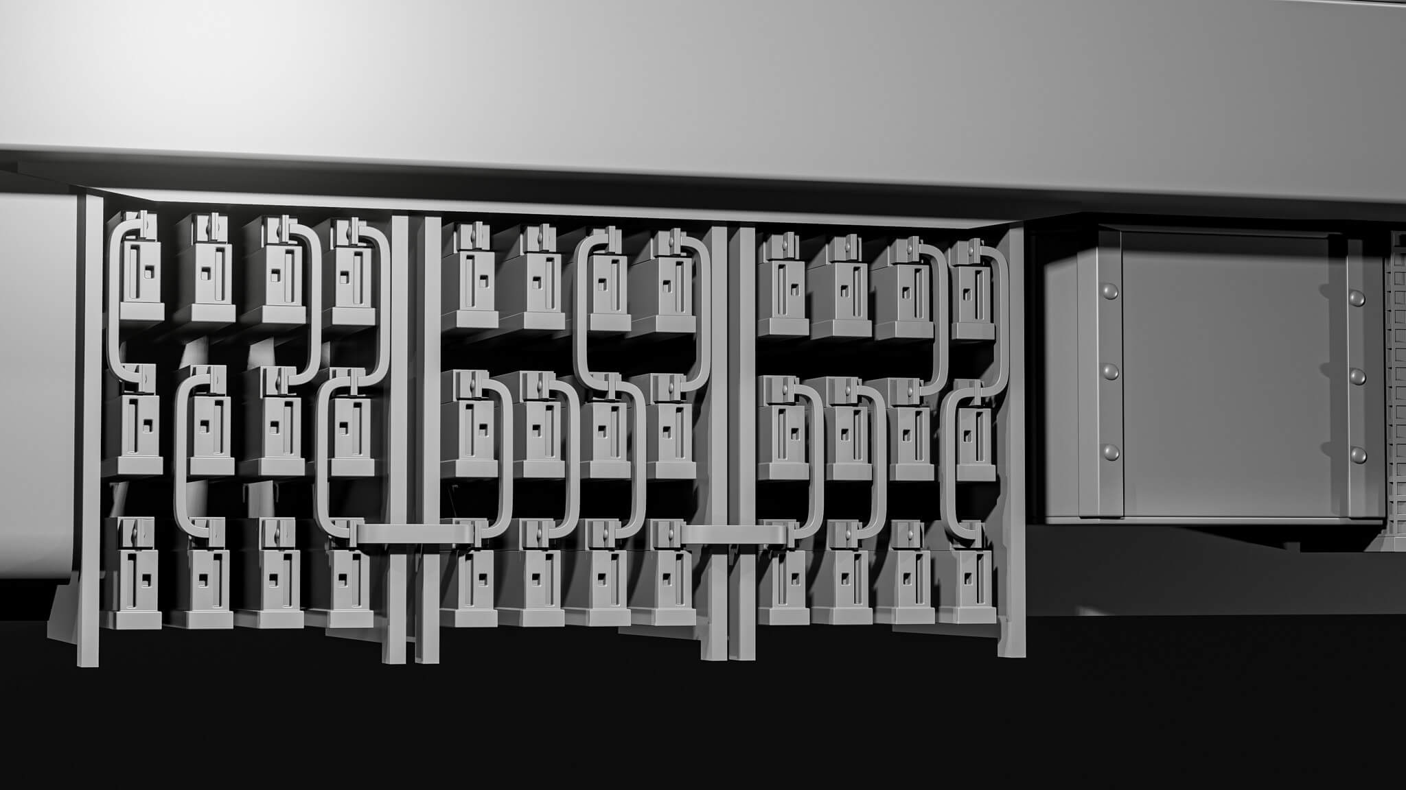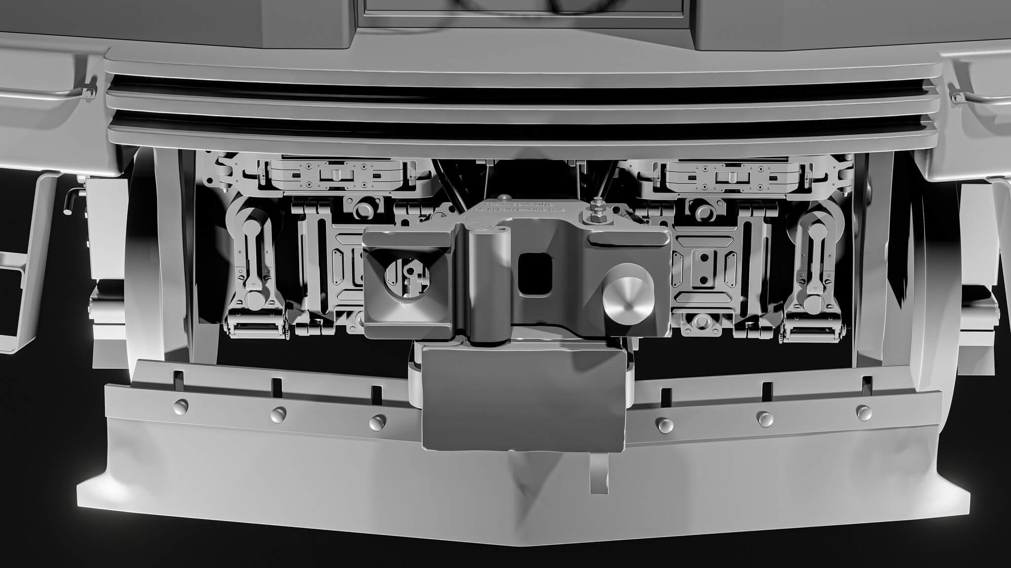镜像是在较大的零件上进行的,因为它们不会引起眼睛太多的注意,而且它们也保持足够的距离,所以不明显。下面示例中的几乎所有内容都在 X 轴和 Y 轴上镜像。我确保在中间保留一个独特的部分来打破模式,以及列车底部的细节。信号灯、车轮和通风口等较小的元素在周围重复,当与镜面部件混合时,它们有助于打破镜面图案。