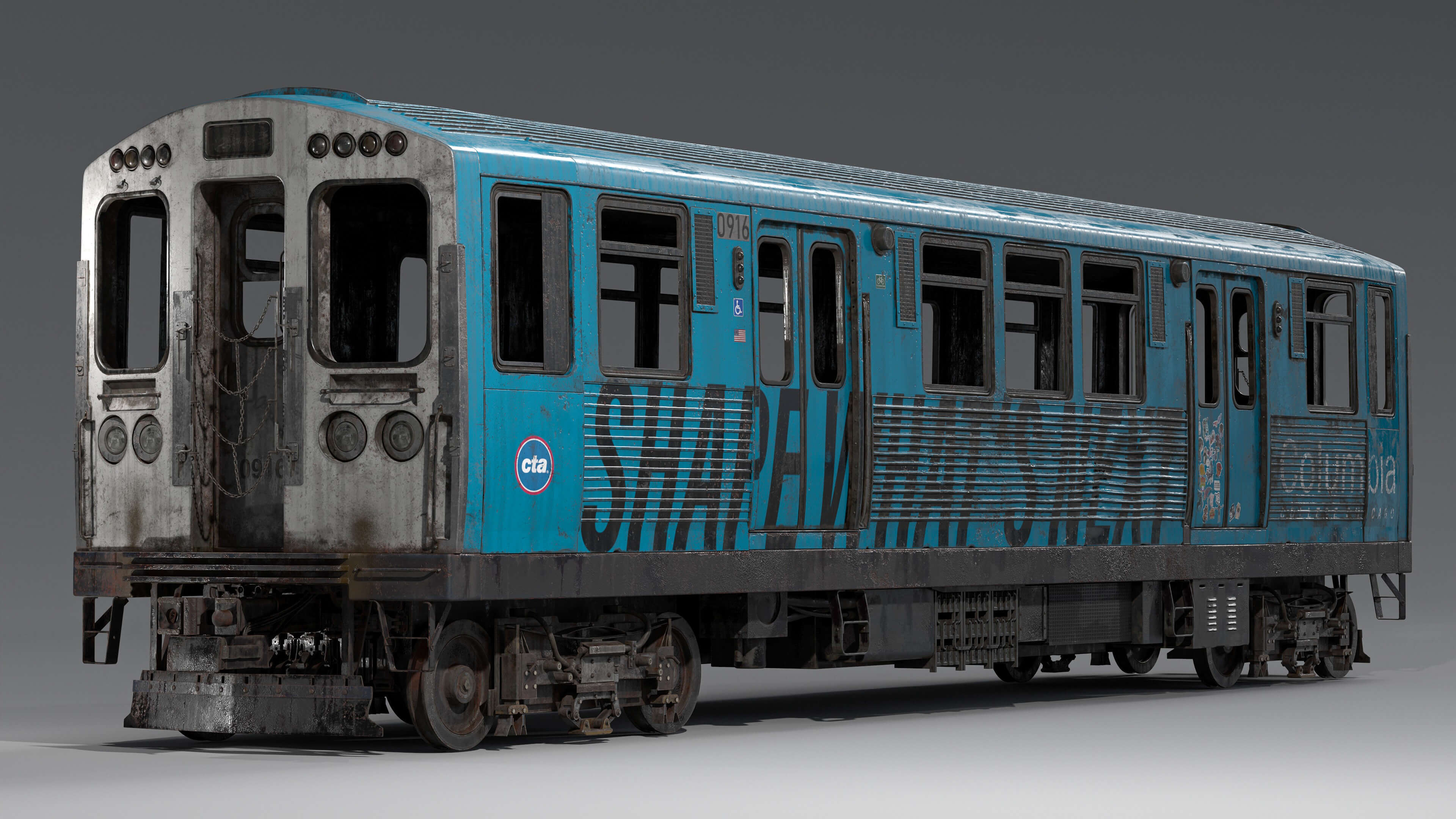 参考收集的过程比我想象的要困难,人们通常喜欢拍摄整个列车的照片,而不是放大我需要的微小机械细节,后来我设法在 CTA 网站上找到了一些当前火车的设计图。最难做的部分是火车侧面的细节以及隐藏在车下方阴影中的部分。我尽了最大努力寻找这些区域的参考资料,但仍然很难确定那里发生了什么。