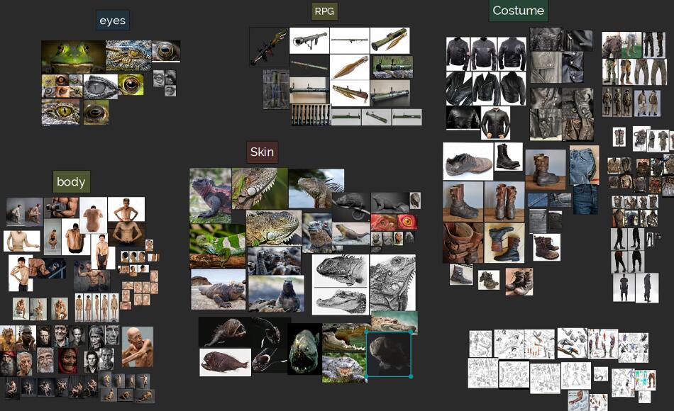 在项目开始之前收集尽可能多的参考文献对于建模、纹理和外观开发总是有好处的。根据上面的描述,John希望该生物拥有反映后世界末日世界的深色皮革服装,灵感来自《疯狂的麦克斯》。
