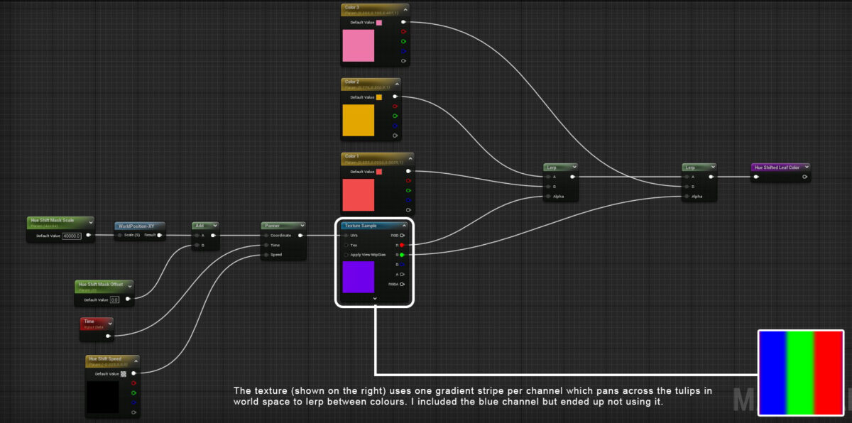 郁金香通过材质中非常简单的设置随着时间的推移改变颜色。三种颜色在每一行上缓慢交替,通过遮罩在世界空间中扫过它们。