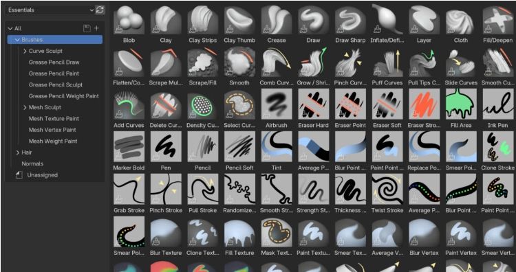 Blender 4.0中引入的新资源架已经扩展,以利用画笔资源。它也被添加到图像编辑器中用于纹理绘画。切换到雕刻等模式,可以找到该模式可用的画笔。