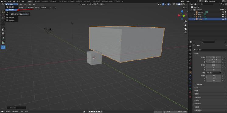 3. 接下来,将鼠标指针移动到界面左上角的【物体模式】按钮上,这表明当前处于物体模式。若要切换到编辑模式,需要点击【物体模式】旁边的下拉按钮。