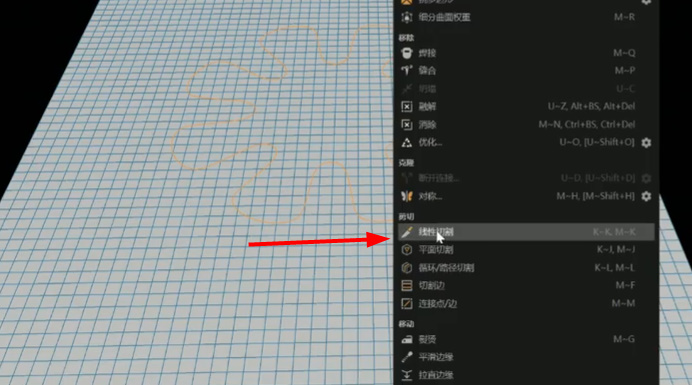 3、让后在回到顶视图,切换到点线面模式,在右击【线性切割】,选择边模式,切换到顶视图之后。