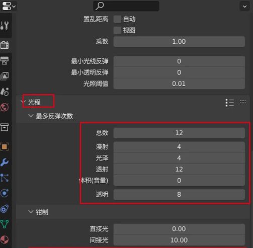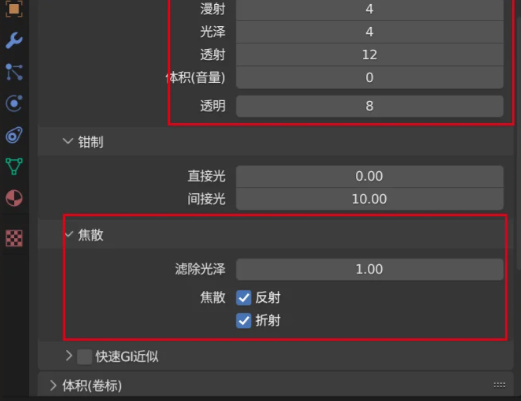 投射可以设置为 6;透明设置为 4;焦散中的反射和折射全部关闭。