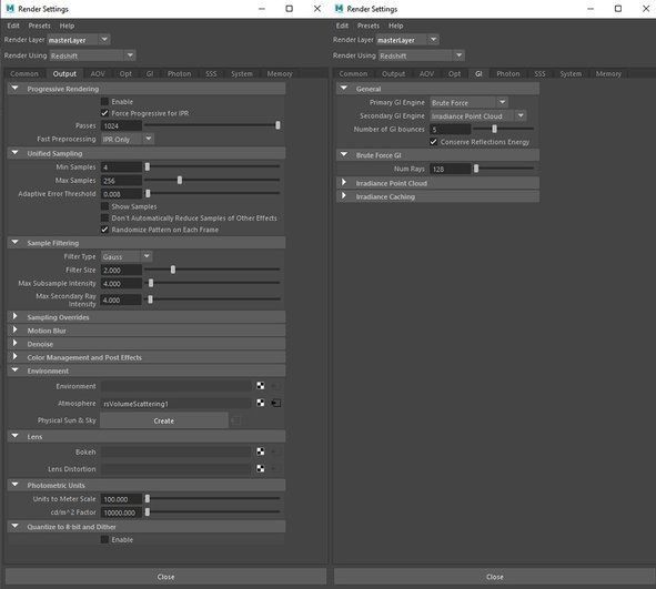 我使用了Brute Force和Irradiance Point Cloud的组合,用于GI解决方案和128 GI样本。使用了最小样本4,最大样本数为256,自适应误差阈值为0.008的设置用来做抗锯齿。