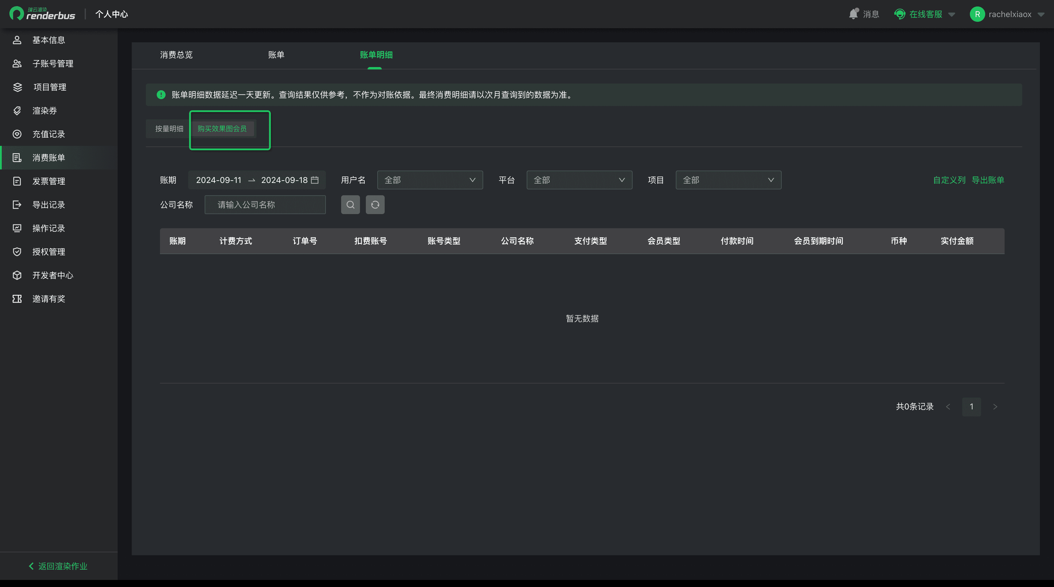 1、账单最多可查询到近三个月内的账单明细,账单明细包括按量明细和购买效果图会员两部分,根据扣费账号、平台、项目、公司名称、作业ID查询具体的账单明细详情